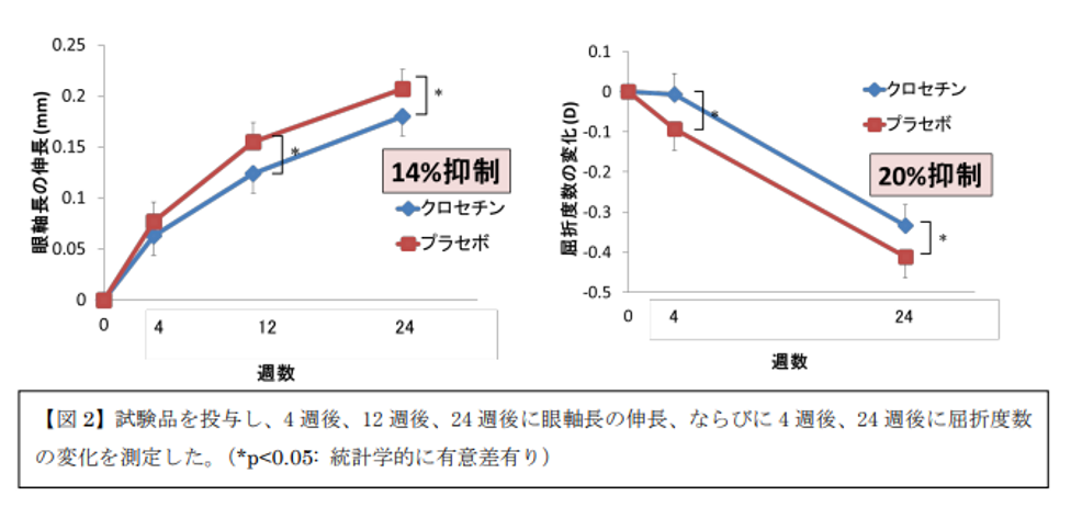 「クロセチン」は近視進行抑制効果があり、ロートクリアビジョンジュニアEXⓇは小学生を対象とした治験において約20%の近視抑制効果を認めました。
