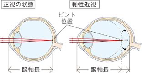 子供の近視は角膜から網膜の長さを表す「眼軸」が長くなってしまうことで起こる軸性近視がほとんどです。近視は成長につれ進行していき、一度眼軸が伸びてしまうと戻ることがありません。